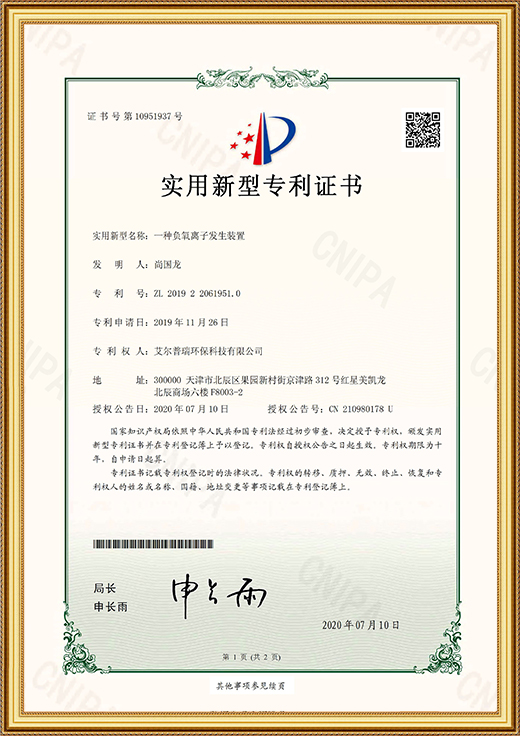 實用新型專利證書(一種負氧離子發(fā)生裝置)